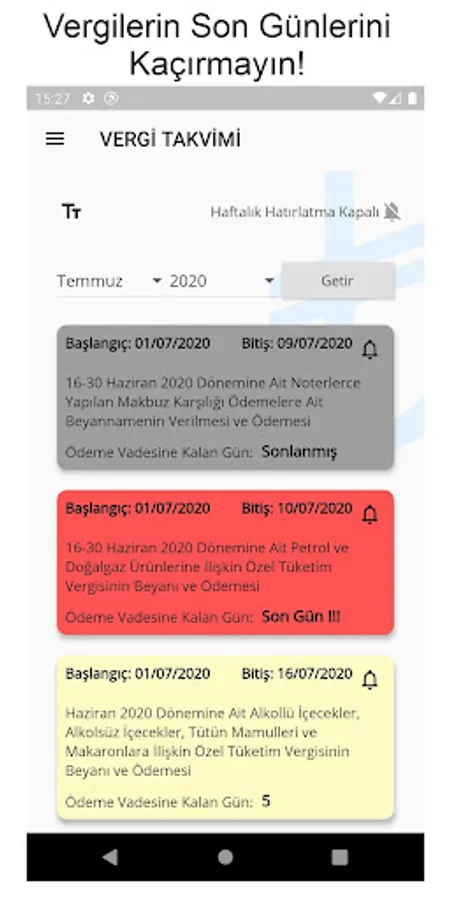 You can easily find out whether the Motor Vehicle Tax, Income Tax, Rental Declaration, VAT, Concise or Corporate Tax has expired or not.