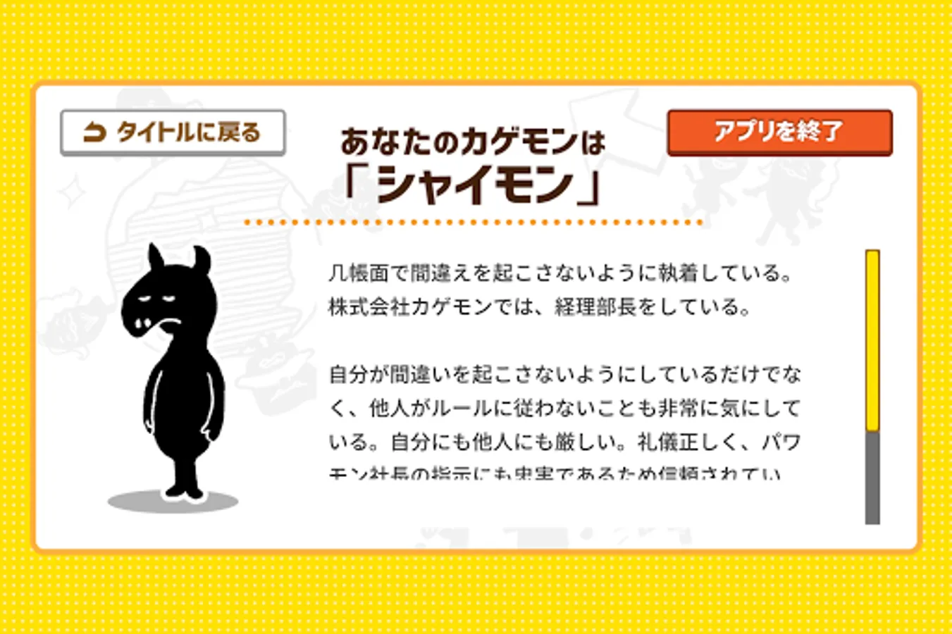当アプリを通じて、自分の気質が分かったら、心の奥にそのカゲモンが住んでいると思って、どうぞ愛着を持って大切にしてください。