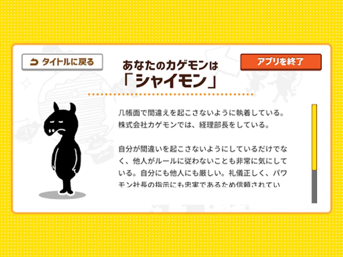 当アプリは衣川氏の著書を元に作成されています。(カゲモン性格診断/ギャラクシーブックス発行)