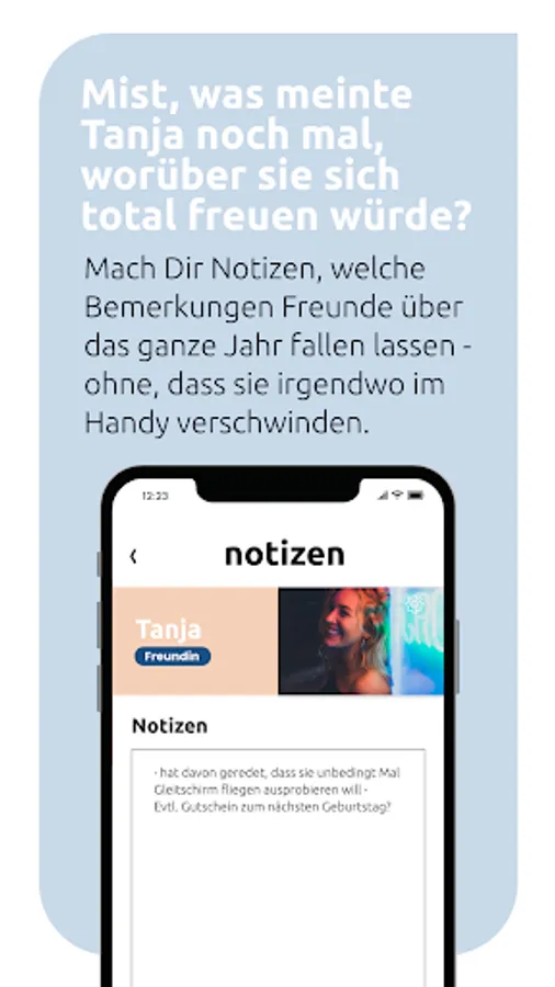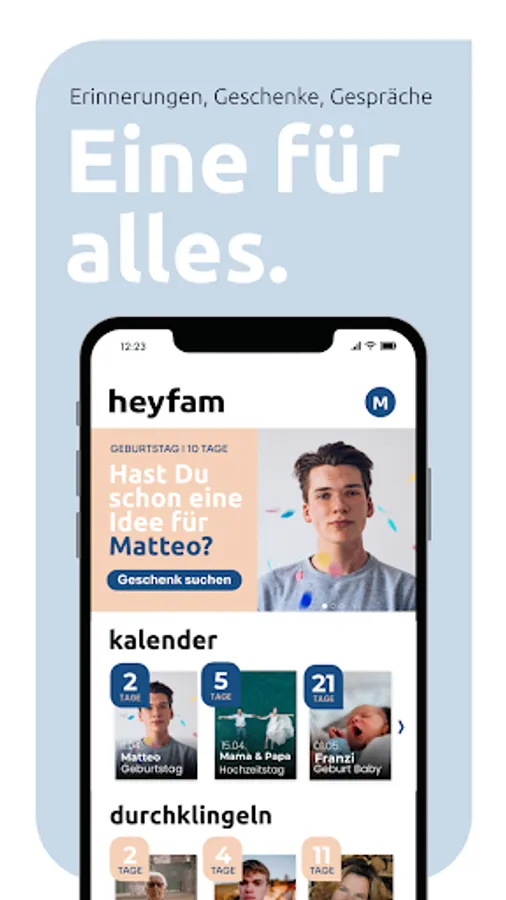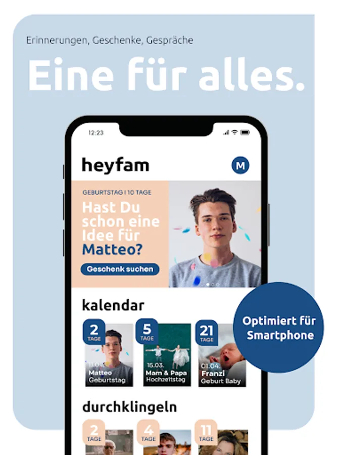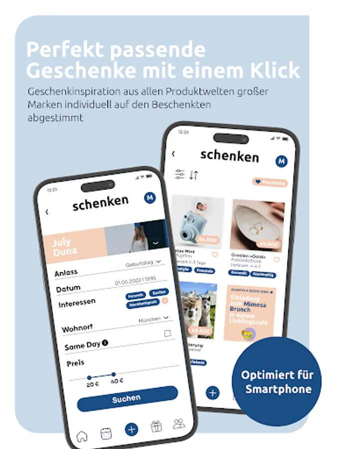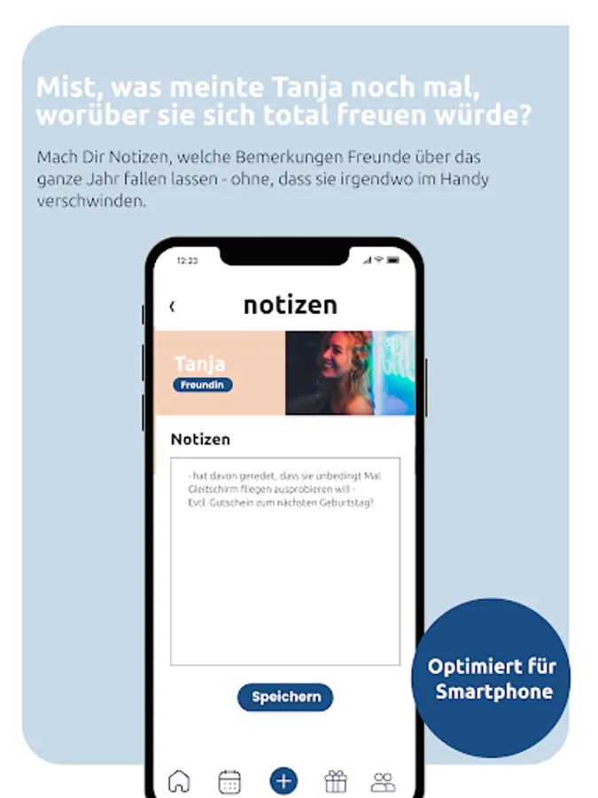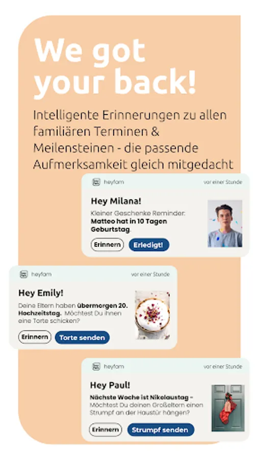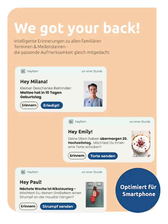 Take a quiet minute, put your closest friends and family on board and we will take care of the rest. We will remind you intelligently and reliably of all appointments and milestones, let you know in good time when it is time to start looking for a gift and give you the opportunity to send loving attention to friends and families to your front door with just one click from the app.
