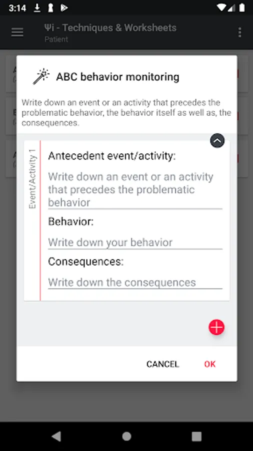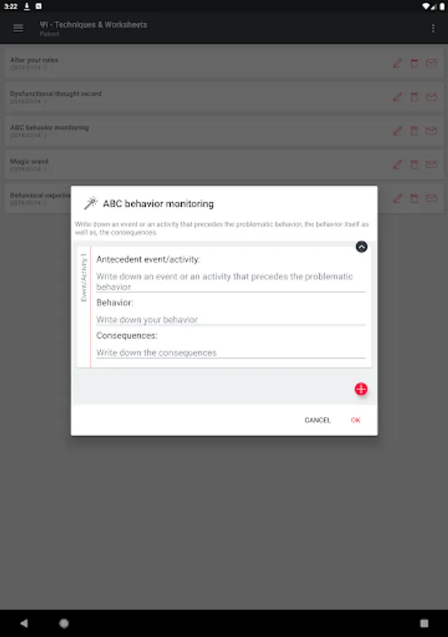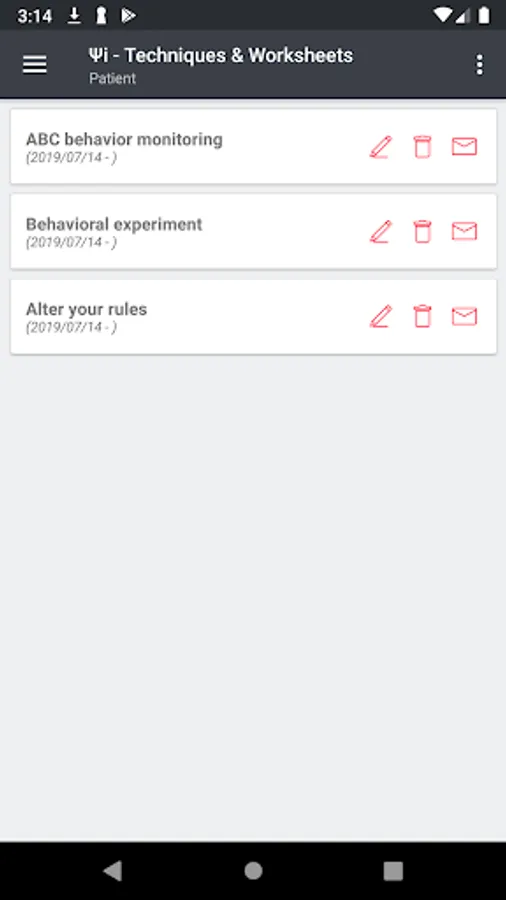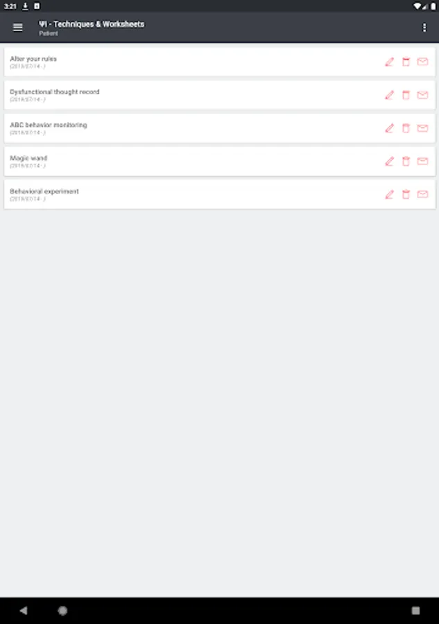 - Techniques & worksheets. As soon as, the therapist decides to give a technique or worksheet to a patient he can simple press the “send” button into his Psy-i (therapist) app, and the technique is sent to to the patient. The patient receives the technique or worksheet into his Psy-i (patient) app, fills the forms. Then he simply presses the “send” button of his Psy-i (patient) app. The technique or worksheet returns to the therapist for review. It is kept into both the Psy-i (therapist) app of the therapist and the Psy-i (patient) app of the patient where they can recall it any time later on.