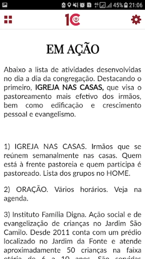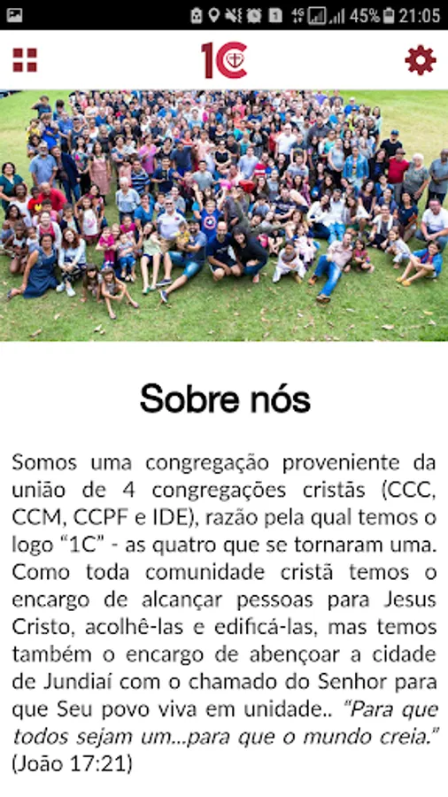 We are a congregation from the union of 4 Christian congregations (CCC, CCM, CCPF and IDE), which is why we have the "1C" logo - the four that have become one. Like every Christian community we have the task of reaching people for Jesus Christ, welcoming them and building them, but we also have the task of blessing the city of Jundiaí with the call of the Lord so that His people may live in unity. " all be one ... that the world may believe. "(John 17:21)