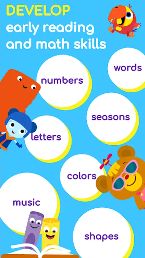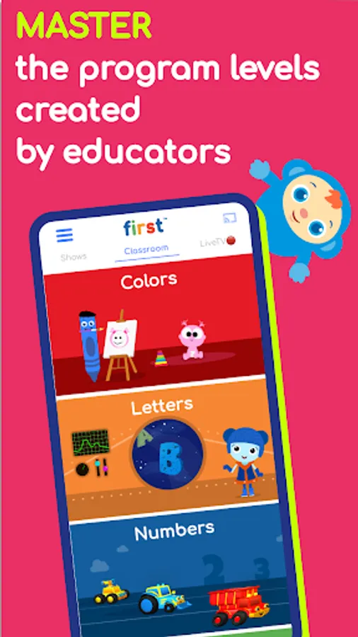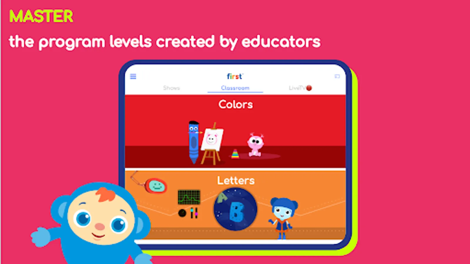 First can develop strong preschool foundations for the future and assist parents anytime and anywhere. We suggest content for daily routines, including features such as educational and fun Songs, Sleepytime to assist in baby's sleep, Books, and Classroom - where your child can learn the school curriculum milestones with games on the Letters ( ABC ), Numbers, Shapes, Colors, Season and Vocabulary.
