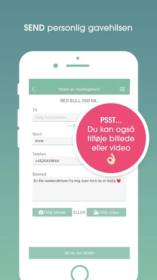 Du kan optage en lille videohilsen, tage et billede og/eller sende en tekstbesked til din ven direkte i app'en. Du skal ikke afgive personlige oplysninger for at bruge appen, det er bare at hoppe ind og så finde den gave du ønsker at sende.