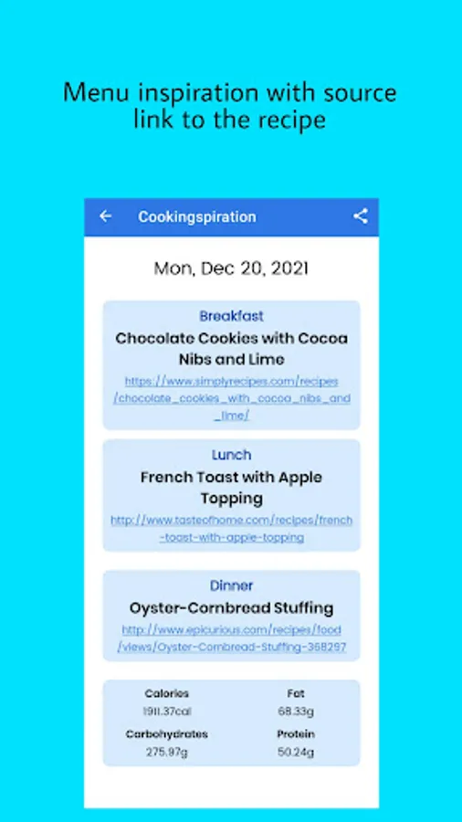 Cookingspiration is an app that generate meal planner with nutrients information and link to the recipe, so users can get meal inspiration for cooking everyday.