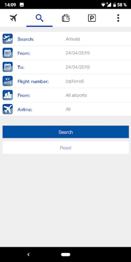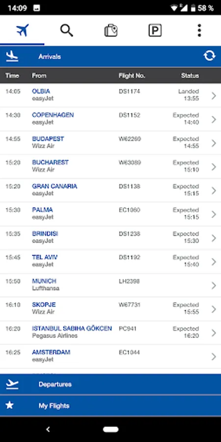 With the search function, all flights of the current season can be found using search criteria in any combination (date, airport of destination or of origin, airline, flight number).