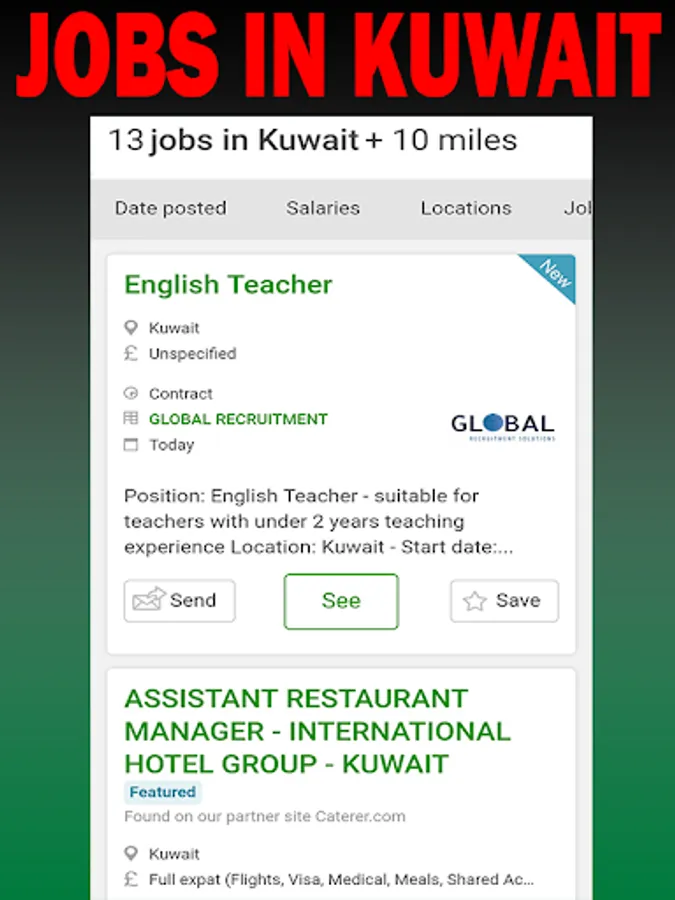 Kuwait Latest Jobs App is a one-stop destination for jobseekers and professionals who are looking for either Kuwait job vacancies for freshers or experienced jobs, or who are looking to land the career/dream job, specifically in Kuwait, Bayan, Bnied Al-Gar, Hawalli, Mishref, Rumaithiya, Salmiya, Salwa, Sharq, Al-Jabriya, Abdullah Al-Salem, Doha, Faiha, Kuwait City (downtown), Mansouriya, Nuzha, Qadsia, Shuwaikh, Shammiya, Sulaibkhat, Abraq Khaitan, Hadiya, Keifan, Khaldiya, Rawdah, South Khaitan, Surra, Udailiya, Andalus, Ardiyah, Fardaws, Farwaniyah, Jahra, Jleeb Al-Shuyoukh, Omariya, Rabiya, Sabah Al-Nasser, Abu Halifa, Ahmadi, Fahaheel, Fintas, Mahboula, Mangaf, Qurain, Riqqah, Sabah Al-Salem, Sabahiyah, Wafra, Al-Zour.