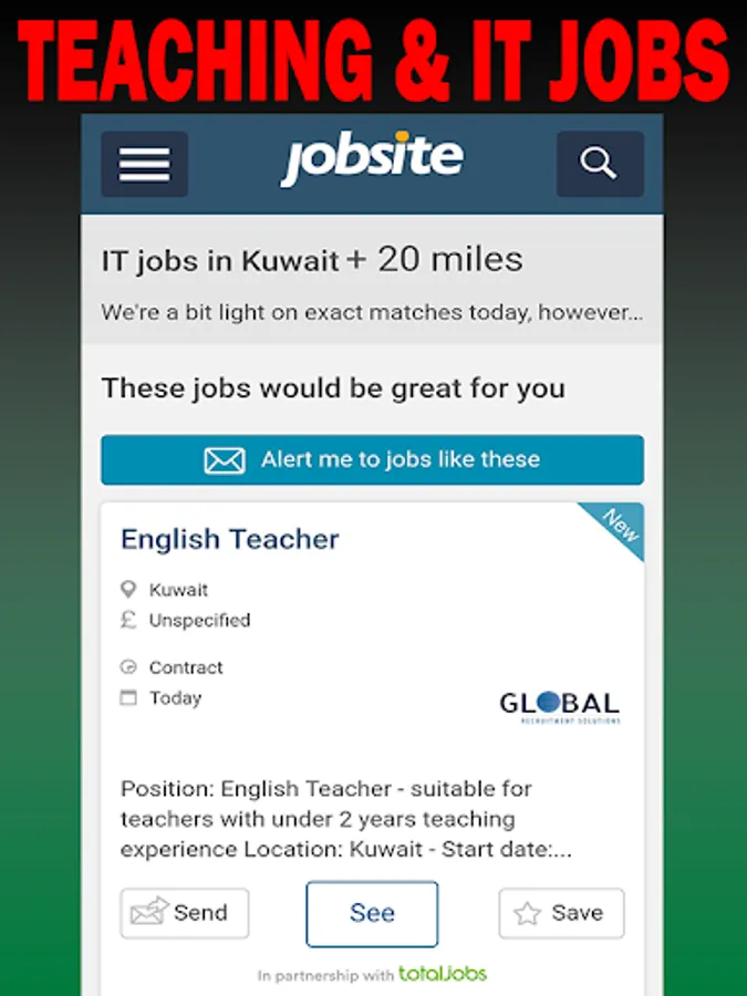 Whether you are a fresh graduate or an experienced professional, looking for full time jobs or part time jobs in Kuwait, this app will help you stay updated with the latest job opportunities in Kuwait’s market and from the top leading job sites, by making all the job offers and vacancies in Kuwait as easy as a swipe from your finger.