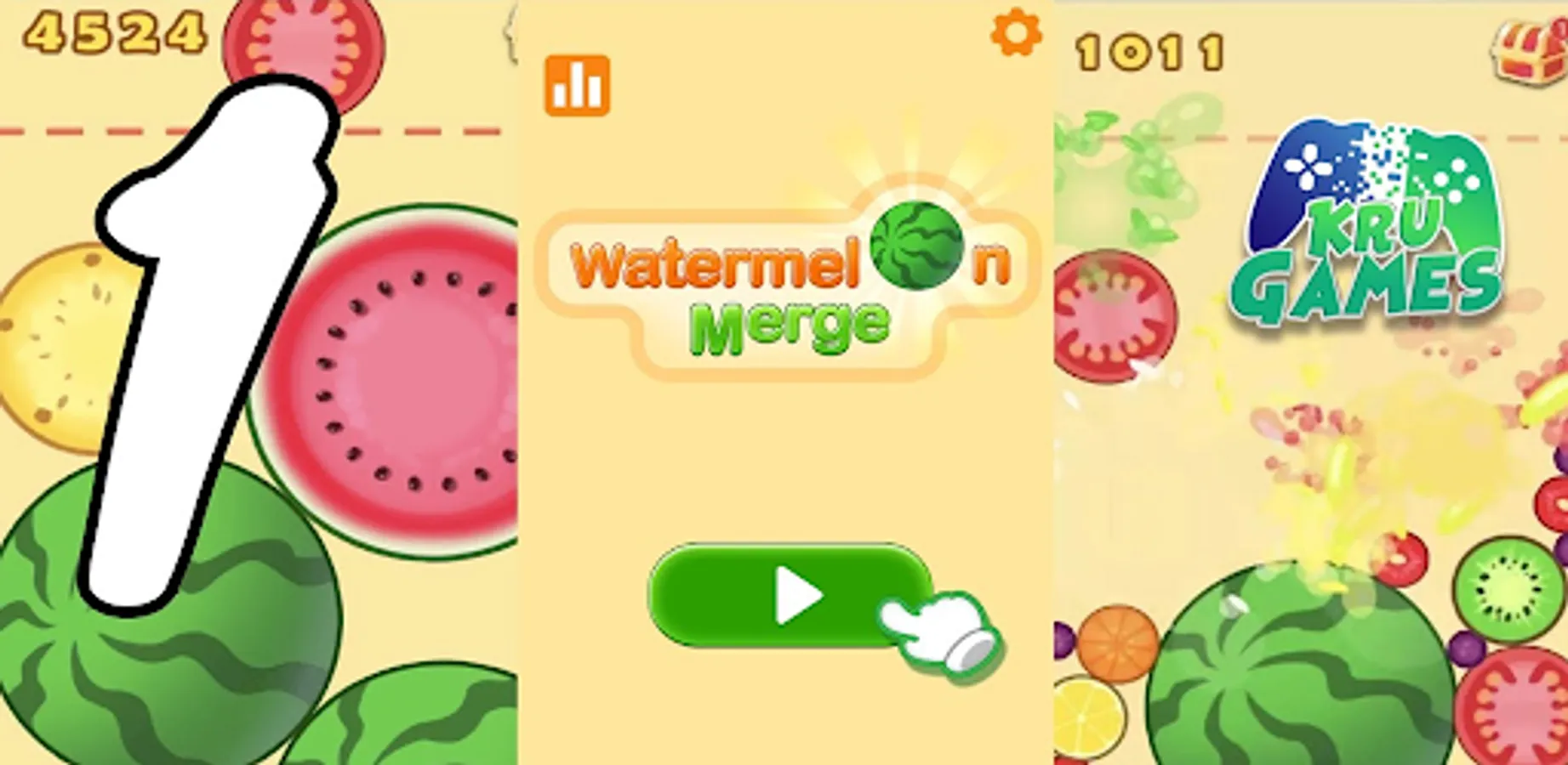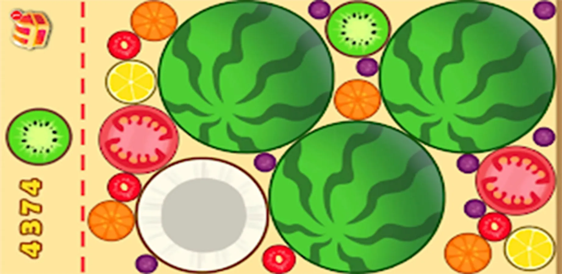 Tap to drop and merge fruit. The same fruits will merge into a bigger one. Try to make watermelon.