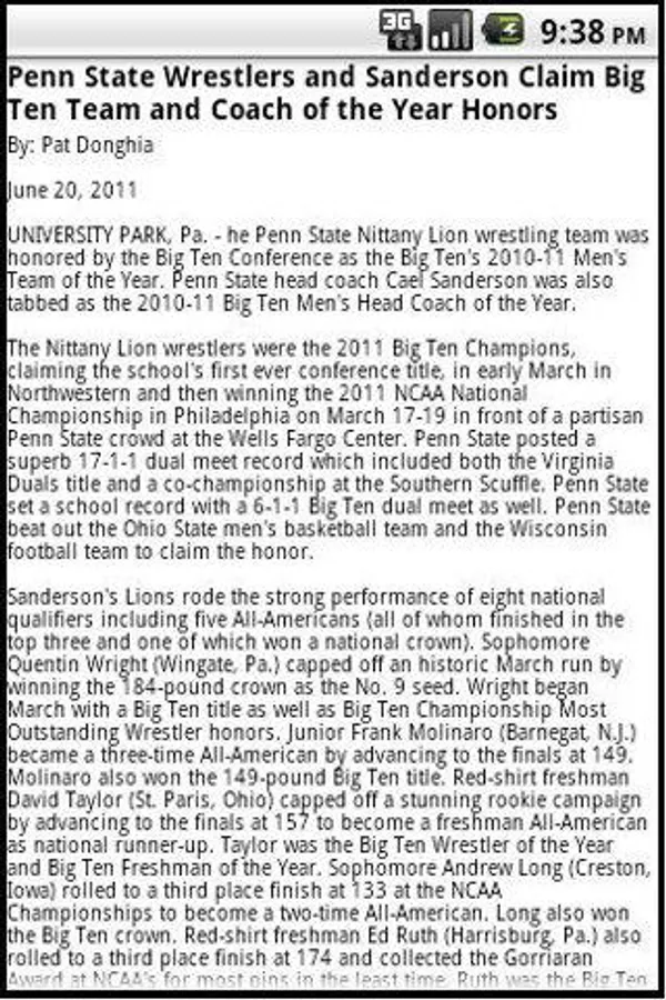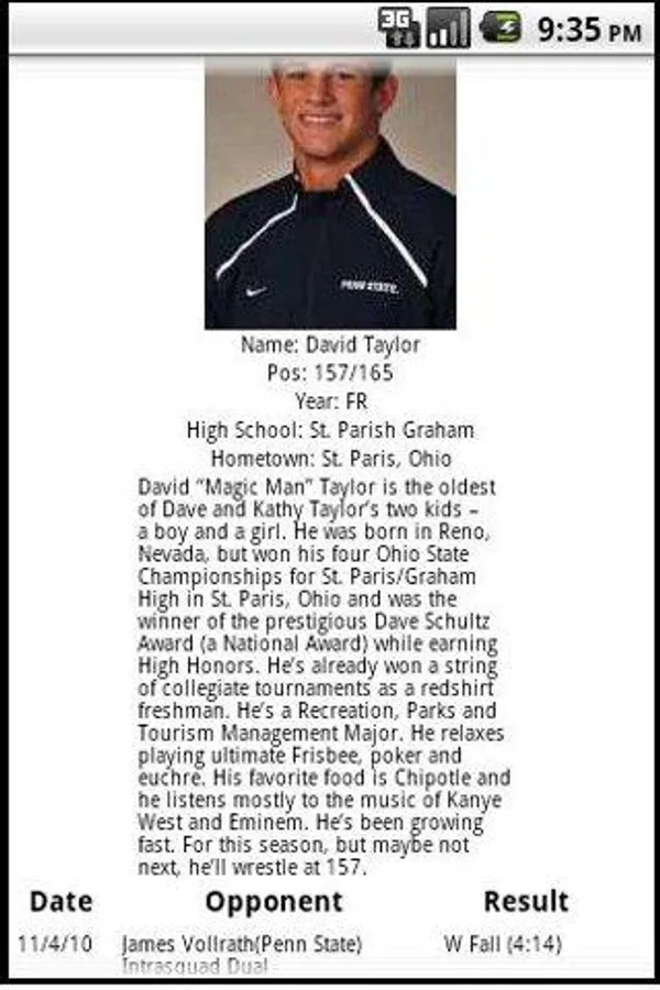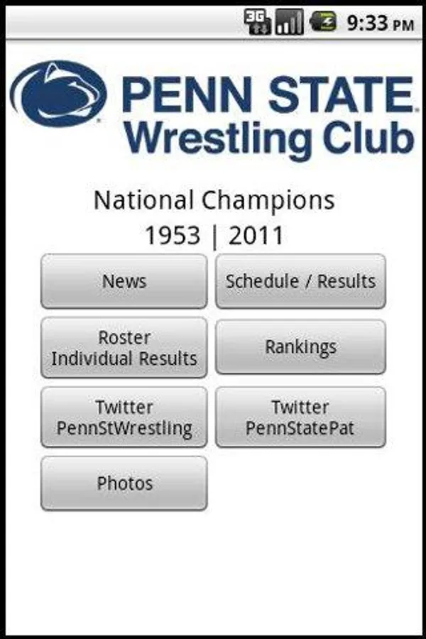 Follow the Penn State Wrestling team from your Android-powered device. This app gives you direct access to: the latest Penn State Wrestling news, current schedule and results, roster profiles including match results for each Penn State wrestler, the latest national rankings, relevant Twitter feeds, and the Penn State Wrestling Club's photo gallery.