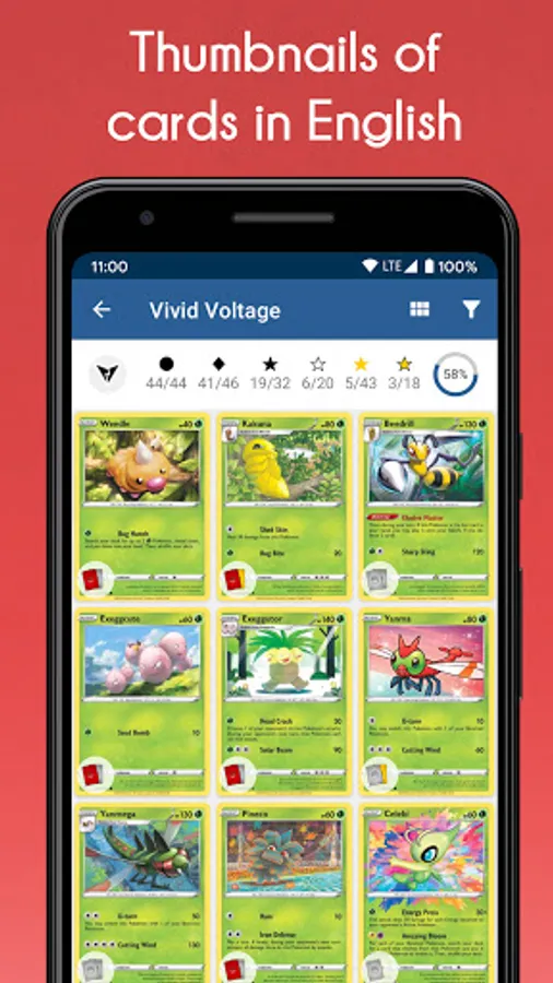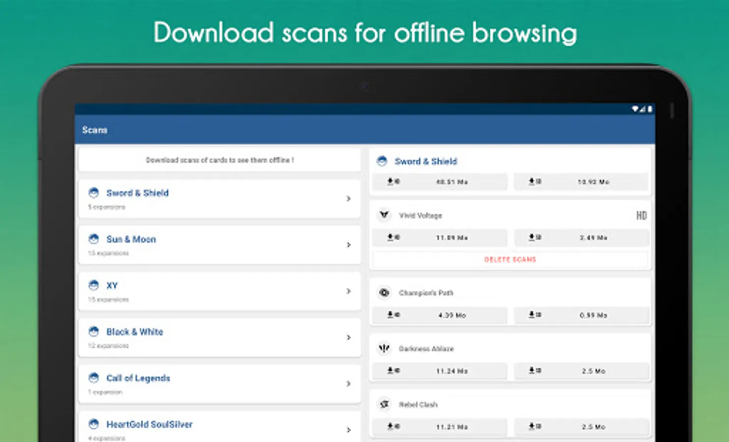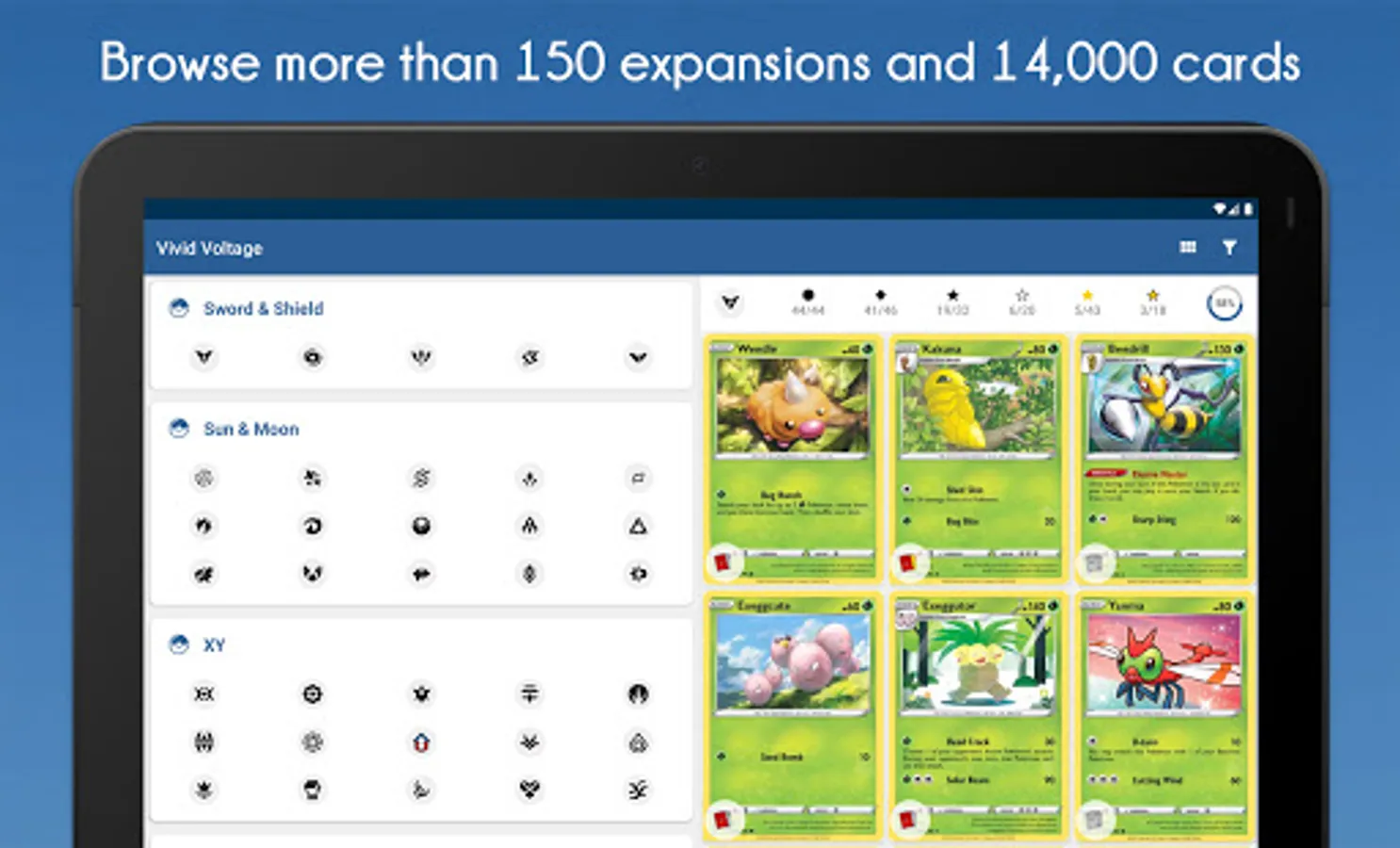 Manage your Pokemon card collection easily and quickly thanks to our application. Our database allows you to browse amongst more than 20,000 cards belonging to more than 200 expansions, from the first to the newest sets including promo cards.