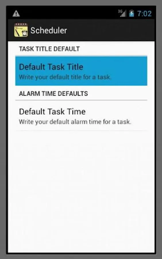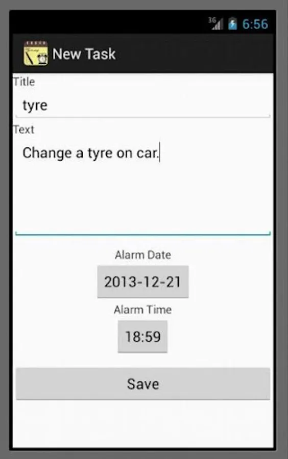 Scheduler is a simple application that lets users to create a list of tasks. Every task have an alarm date and time when the user will be notified of the task. Notification is via status bar and alarm sound. Easy to input, edit and delete tasks. Push your menu button, add new tasks or adjust settings. Layout for adding and editing is simple and contains only a few fields: Title, Text, Alarm Date, Alarm Time.