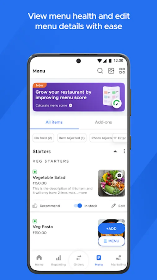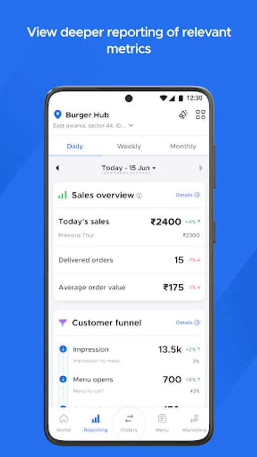 - View your payouts and track your key business metrics around delivered orders, sales, average order value, bad orders, customer funnel, marketing and dish trends.
