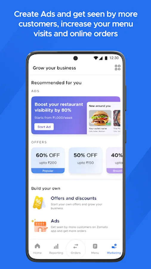 - Create offers and ads for customers or mealtimes and track performance to take your business to new heights instantly with no hassle and 100% transparency.