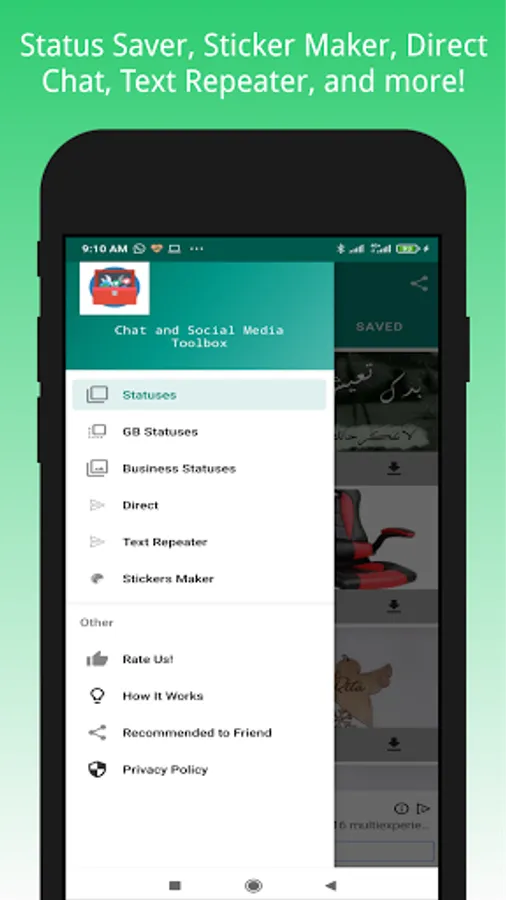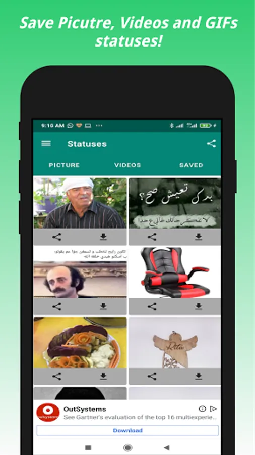 Allow you to save photo images, GIF, Video of the new status feature, and it also allows you to share media and repost status from app to your friend.