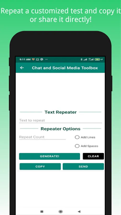 Do you want to repeat a certain text for x amount of lines or time, this tool provides you the easiest way to do so!, you can even share the text to an app or copy it without any hassle!
