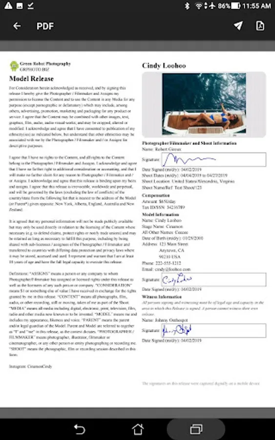► Collect all the data and signatures you need right on your iPhone, then email a PDF and JPEG of the release to you and/or model