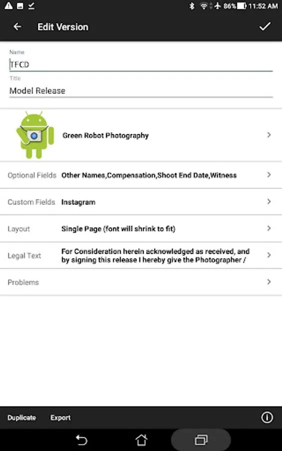 Easy Release Pro is the only professional model release app that replaces inconvenient paper model release forms and contracts with a slick, streamlined app. Collect all data and signatures right on your Android mobile device then email the release PDFs or store them to cloud services. Comes bundled with industry standard (Getty Images) model and property releases in 17 languages. -- Easy Release is the #1 photography business app!