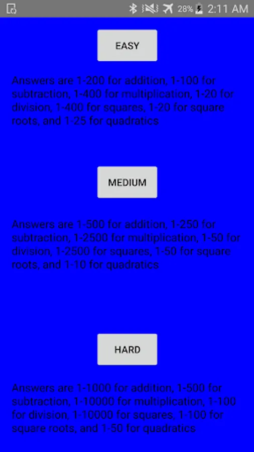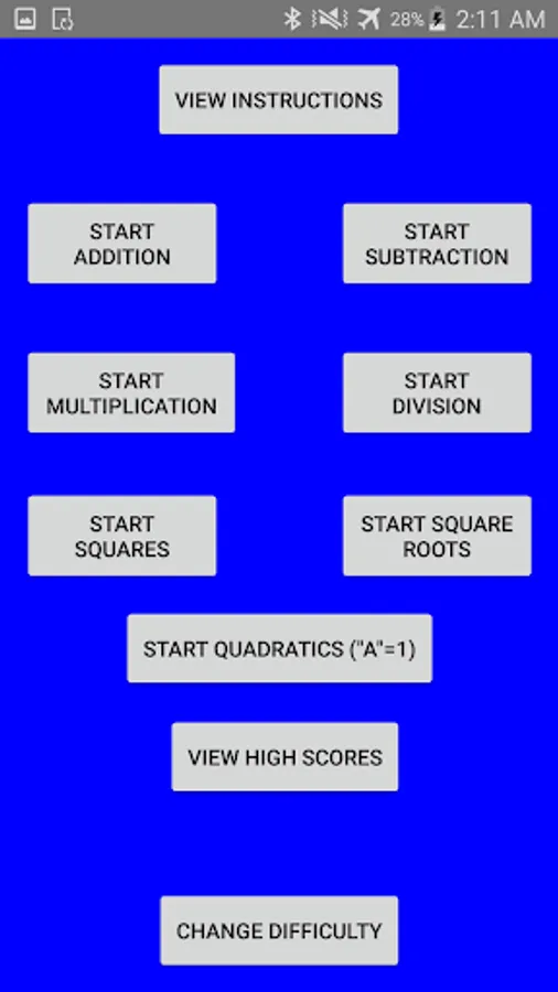 Practice addition, subtraction, multiplication, division, squares, square roots, and quadratics and try to improve your speed with this app. Answer 10 questions of the selected operation correctly as fast as you can and try to get a high score.