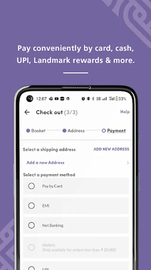 • Pay by cash, Credit or Debit Cards, Wallets, NetBanking and Landmark Rewards.
