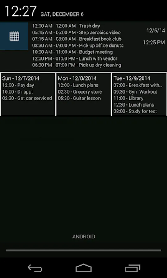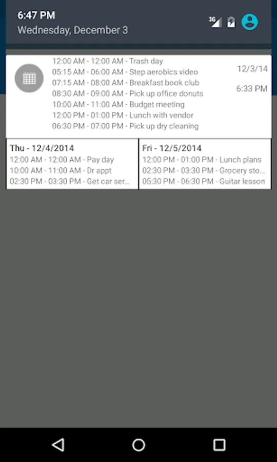 The Android notification drawer is my favorite place to get all of the quick updates I need. Every morning it's my first stop to check the weather forecast, scan email messages, get important alerts, and now see my calendar itinerary for the day. Having my daily events displayed and updated as a notification is more convenient than I ever realized it could be!