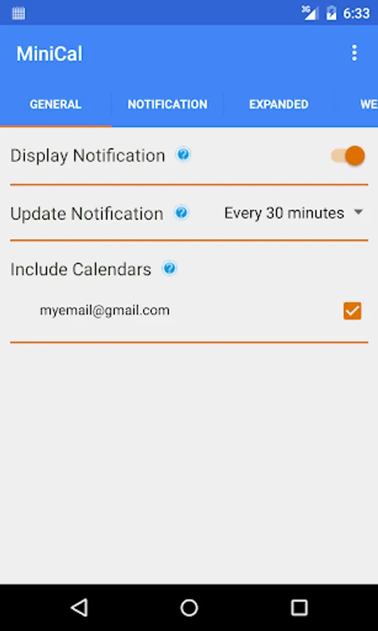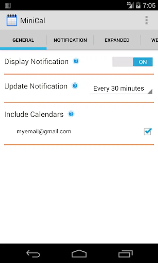 Run at startup – This permission is necessary to enable MiniCal to restart the notification when you reboot your device. This saves you the trouble of re-launching the MiniCal application after a device boot. If you set Display Notifications to OFF in the MiniCal application General settings then MiniCal will not do anything after a device reboot.