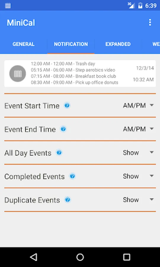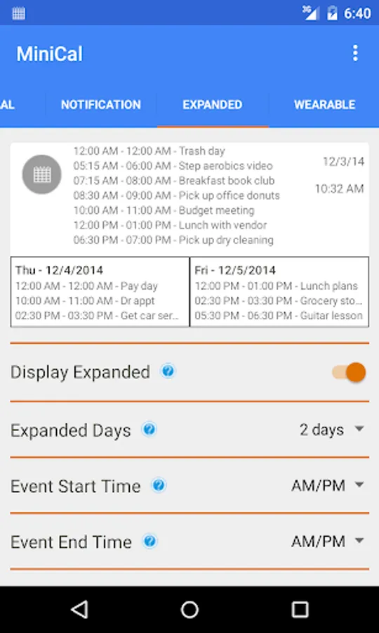 MiniCal isn't the only application to provide this type of functionality but I had a certain look and feel that I wanted to achieve with the notification display and I just couldn't find anything else that came close. I have more updates planned for MiniCal so if there is something that you would like to see or if you find anything that doesn't work for your device, locale, Android version, etc. please let me know.