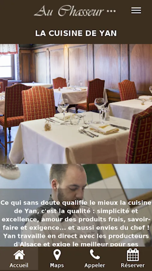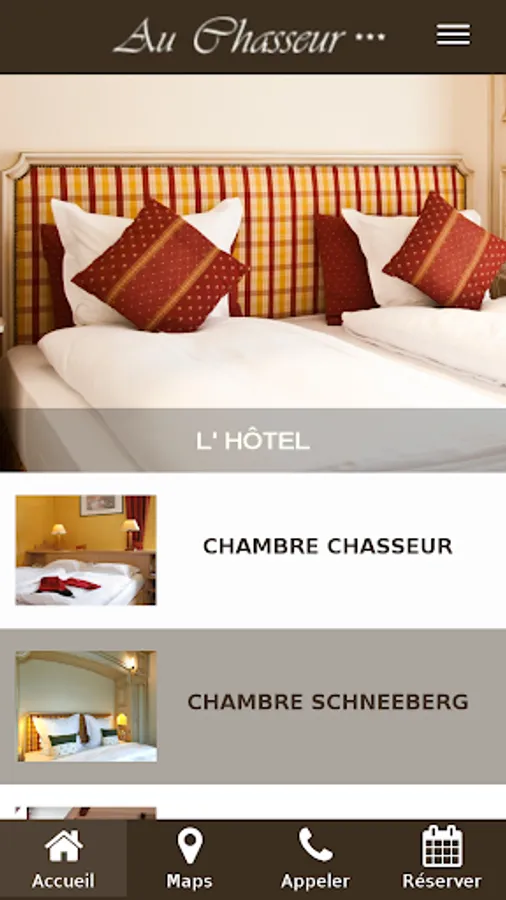 The application Hotel Restaurant Au Chasseur *** provides access to practical information as well as different services and hotel activities.