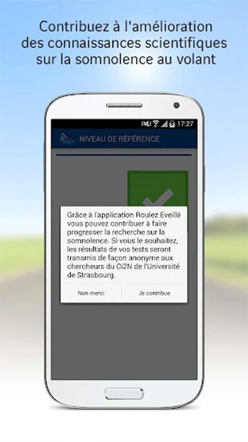 With its history of testing, the user can identify periods where his arousal level is not satisfactory. The application then is useful in the planning of its trip. The test of arousal was developed and tested as part of a scientific study by the Centre for Neurocognitive and Neurophysiological Investigations (Ci2N) from the University of Strasbourg. It is possible to participate in this study drowsiness by sending anonymous data from its tests Ci2N Strasbourg.