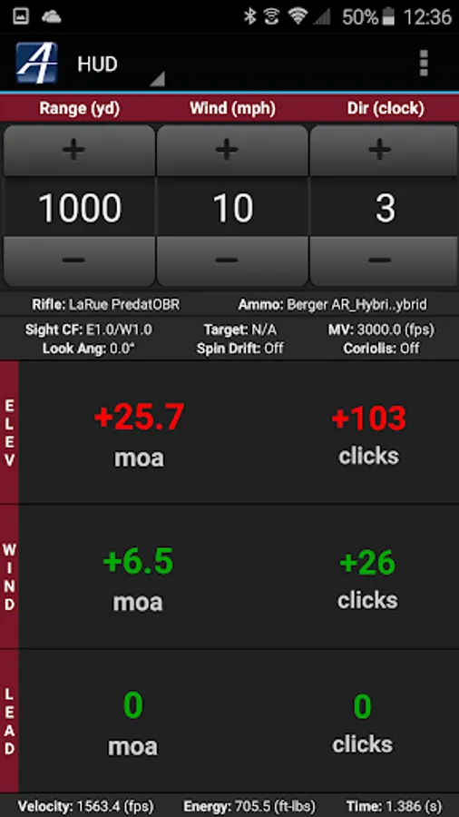 * HUD solution view for fast re-calculations for changing target distances, wind and lead