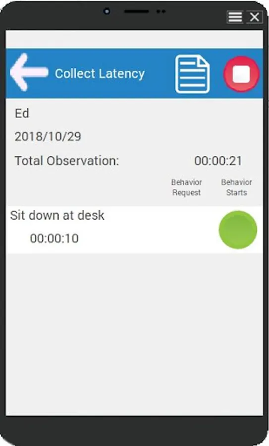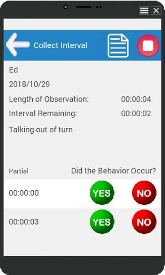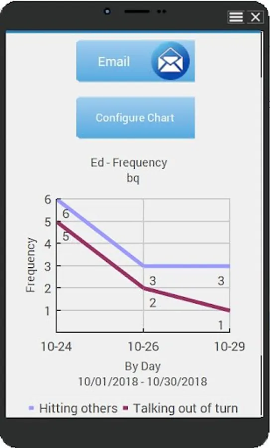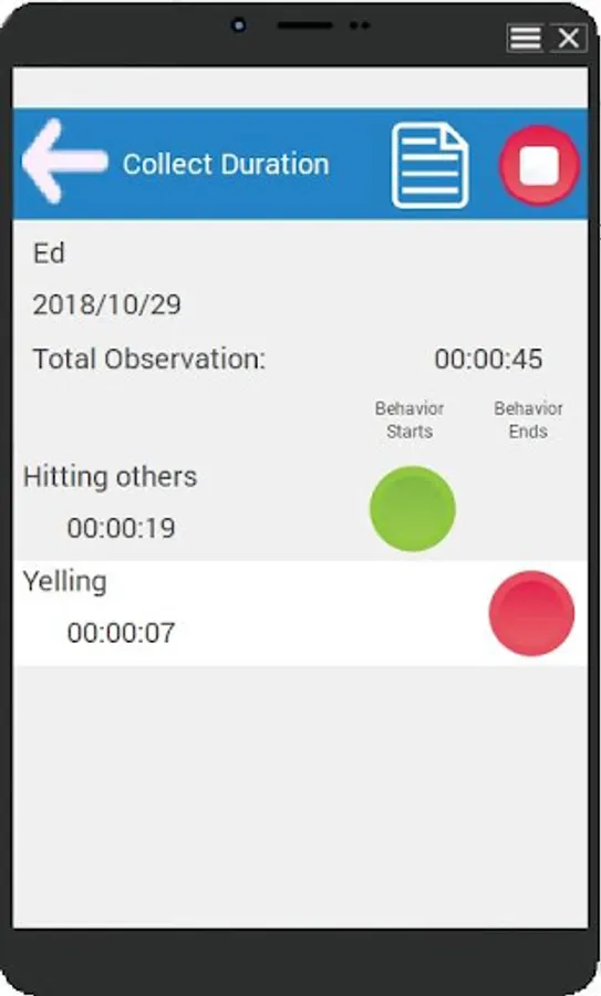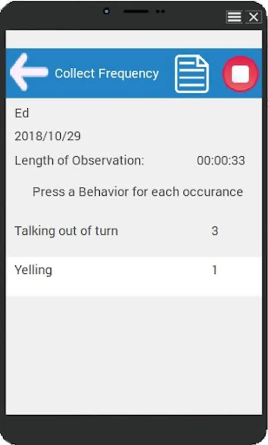 All collection methods have real time data entry that is as easy as pushing a button. The app automatically tracks the total observation time along with the individual data for the collection method. Results can be instantly viewed or graphed - without leaving the app! The graphs can be for a single date or a range of dates and can be emailed for incorporation into functional behavior assessments, behavior intervention plans and reports supporting individual education plans.
