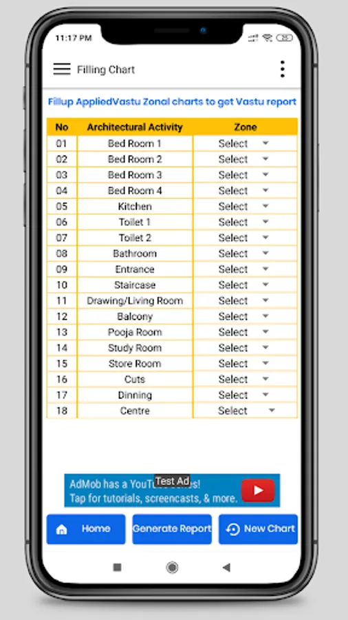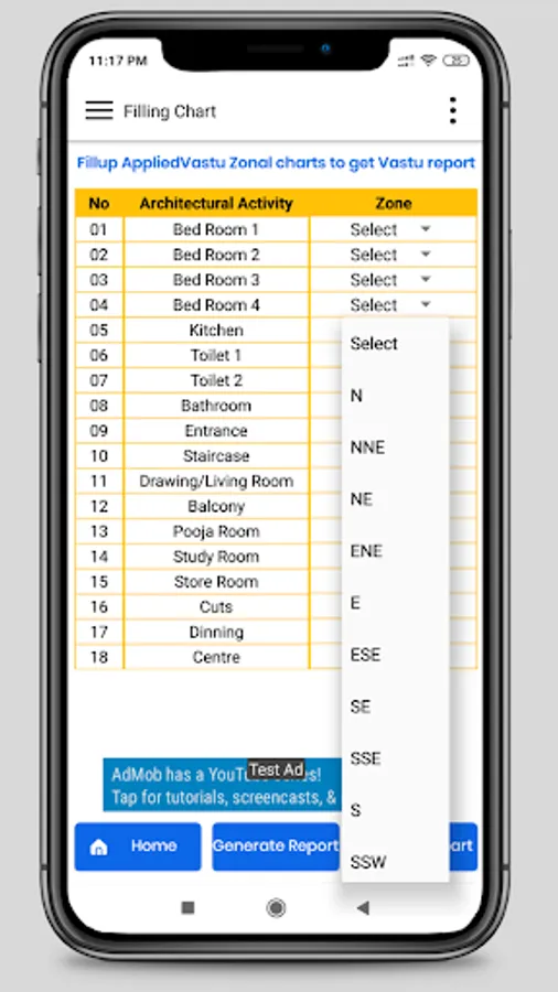 By filling Charts: In this case, the inputs for vastu calculation are individual, totaling 17 inputs have to provide. After filling the charts, click the generate button to get the vastu to report.