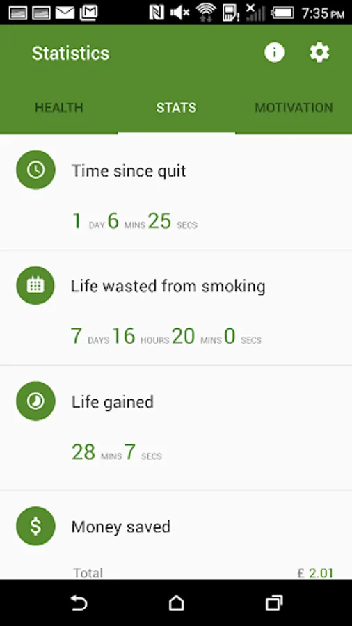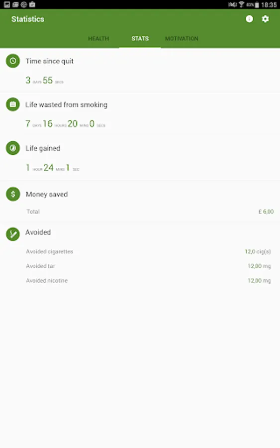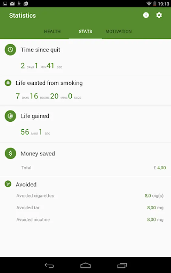 Quit Tobacco makes it clear to see the benefits after stopping the habit by showing you your statisitics. Know exactly how much time and money you have saved since quitting. How many cigarettes you have avoided. Knowing this information serves as a great incentive to keep going and remain smoke free.