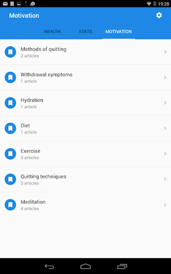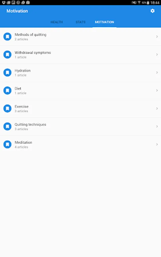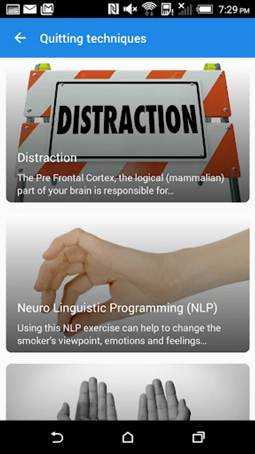 We understand that people are usually inclined to put away hard decisions. Whether you have decided to quit now or in the future, the motivator alarm serves to notify you daily with motivational quotes before and during the time you have quit. The featured motivation section within Quit Tobacco is there to give you useful knowledge and techniques to help stop you from relapsing. There are tutorials on meditation, Neuro Linguistic Programming and a variety of topics to educate yourself and stand a better chance of staying on track.