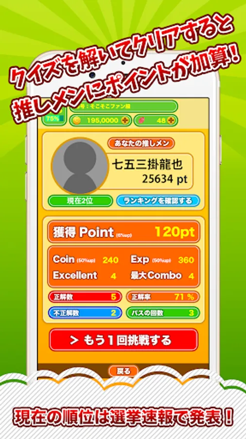 クイズを10問解くと推しメンにポイントが加算されます。(全問正解でポイント2倍!)