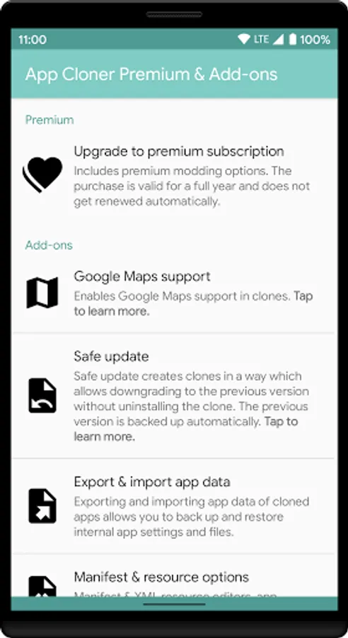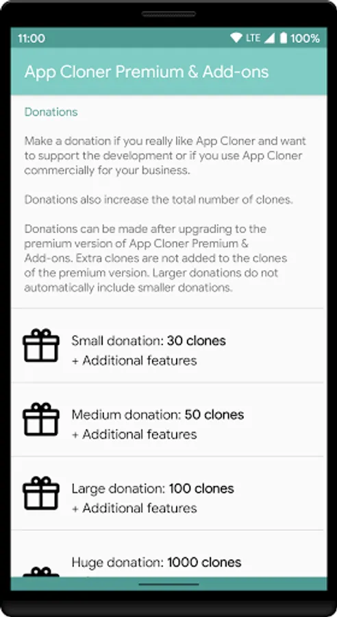 This app allows you to purchase the App Cloner premium license, add-ons & make donations.