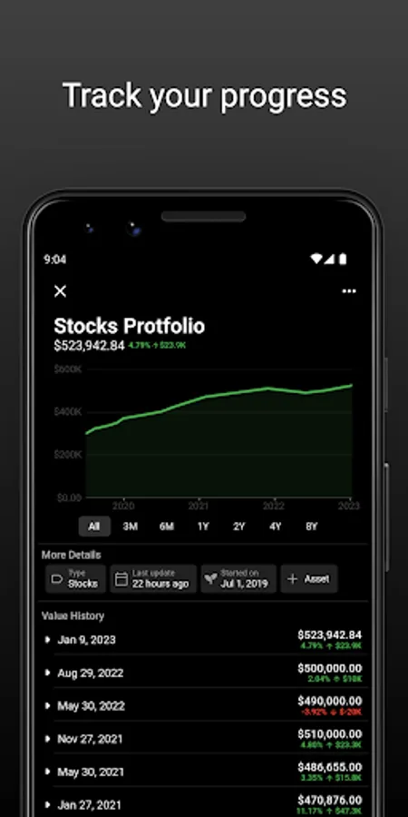 Keep your portfolio updated over time, and WorthTracker will help you to see your progress toward your financial independence goals with visualization of your progress, and asset allocation graphs.