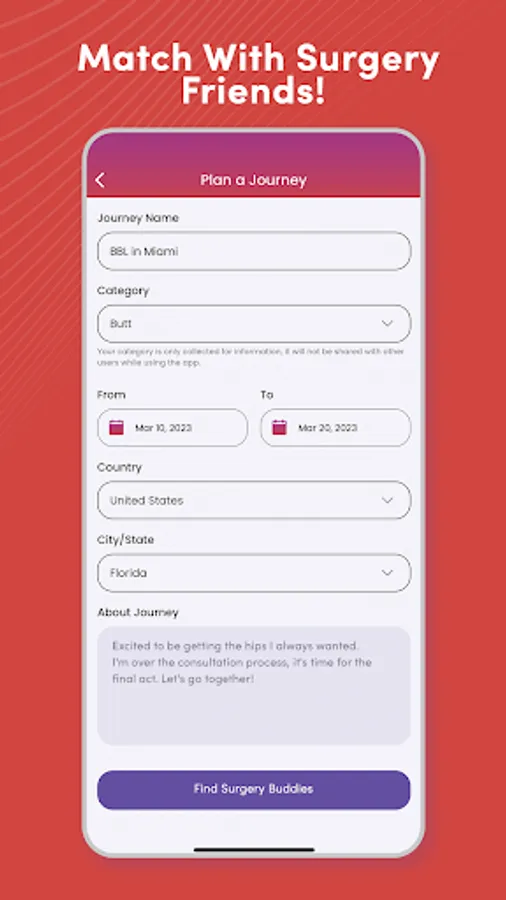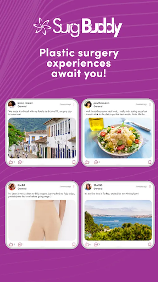 SurgBuddy is the one and only free app focusing on people planning a plastic surgery and looking for a surgery friend. This app allows surgery community members to meet, connect, share experiences and plan journeys together. With SurgeryBuddy, you can post content such as photos, videos, text and you can also create and join groups. Connect with your surgery friends, set journeys together, and find discount opportunities all arount the World!