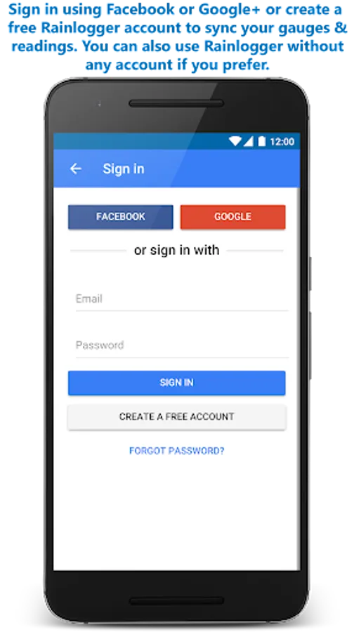 Please note that you can sign in with Facebook or Google+ or Sign up for a free Rainlogger account if you don't want to use the Facebook or Google+ sign in options. This is totally optional you can use Rainlogger without any account.