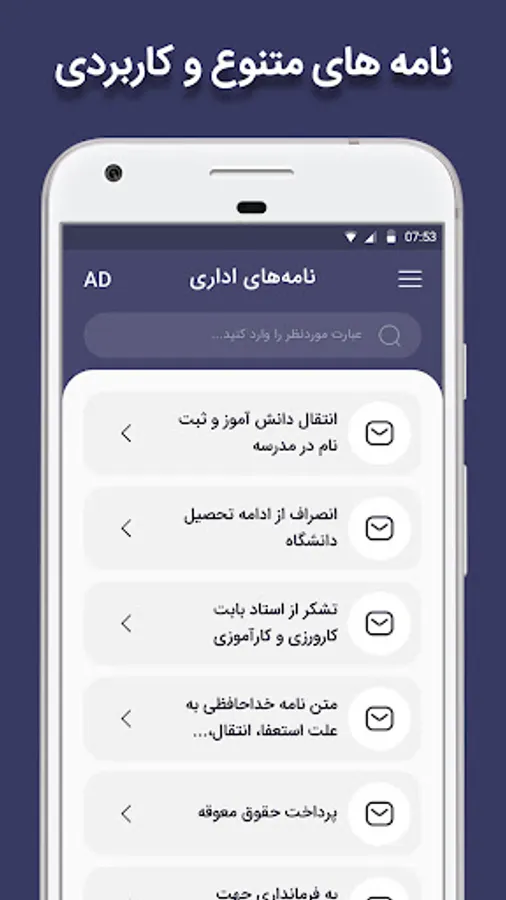 این اپلیکیشن حاوی کاربردی ترین نمونه نامه های رسمی اداری دانشگاهی درخواست شکواییه قولنامه قرارداد و... می باشد که به یقین مورد استفاده اکثر مخاطبین خواهد بود.