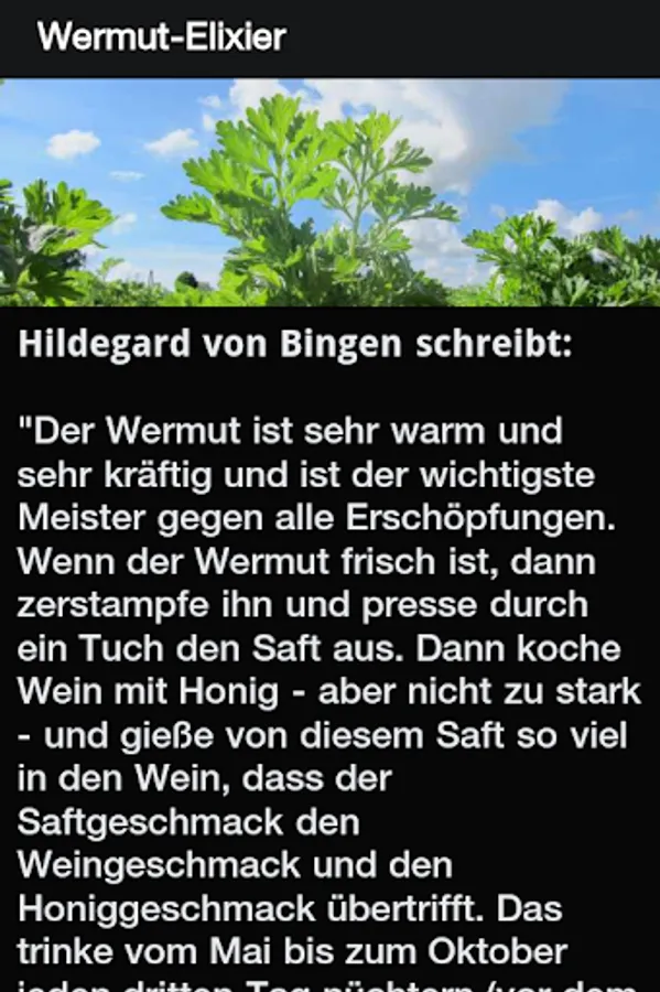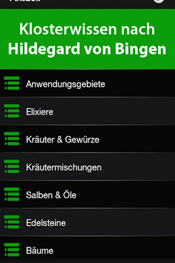 Hildegard von Bingen provides useful additions from the pharmacy of God. Nature gives us often several ways to use also this knowledge as a first step back to a conscious life. Take the side-effect free alternatives by Hildegard von Bingen. Get now "Hildegard" on your smartphone.