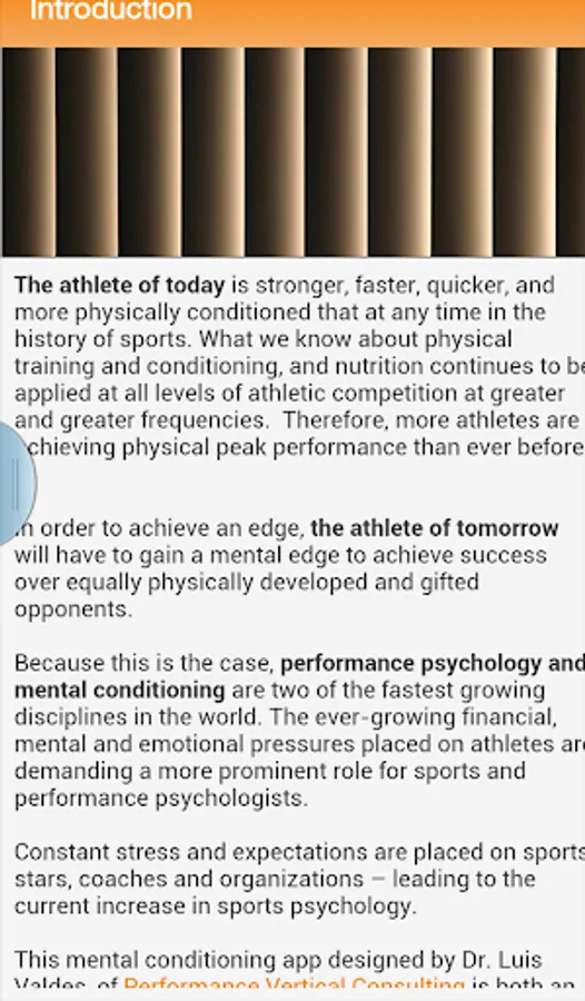 This app provides a wealth of information about mental conditioning and sports psychology. Included in this app is information about mental imagery, visualization, self-talk, and mental preparation. This app also keeps you up with the latest news, social media sites, products, and services provided by Performance Vertical Consulting.