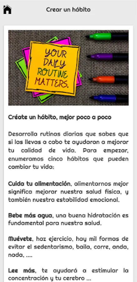 You will find in the "Healthy Life Habits" app tips on how to create a new habit or routine. Various studies tell us that it takes about 21 days to acquire a new habit. Challenge yourself, choose the habit you like the most and make it a reality.
