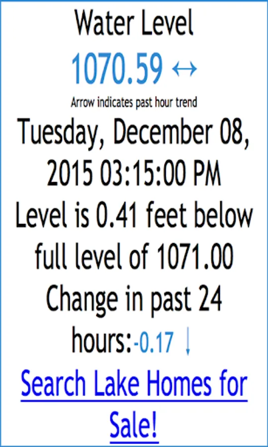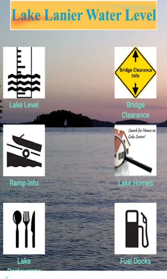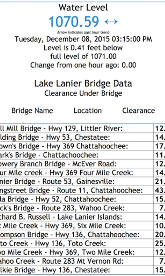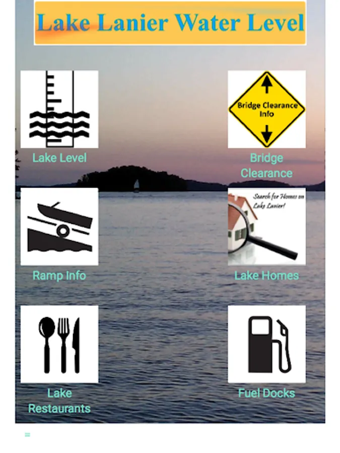 This app provides the current available water level for Lake Sidney Lanier, Georgia. It also provides boat ramp depth and usability status based on current water level as well as bridge clearance heights for most bridges on Lake Lanier.