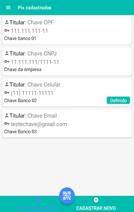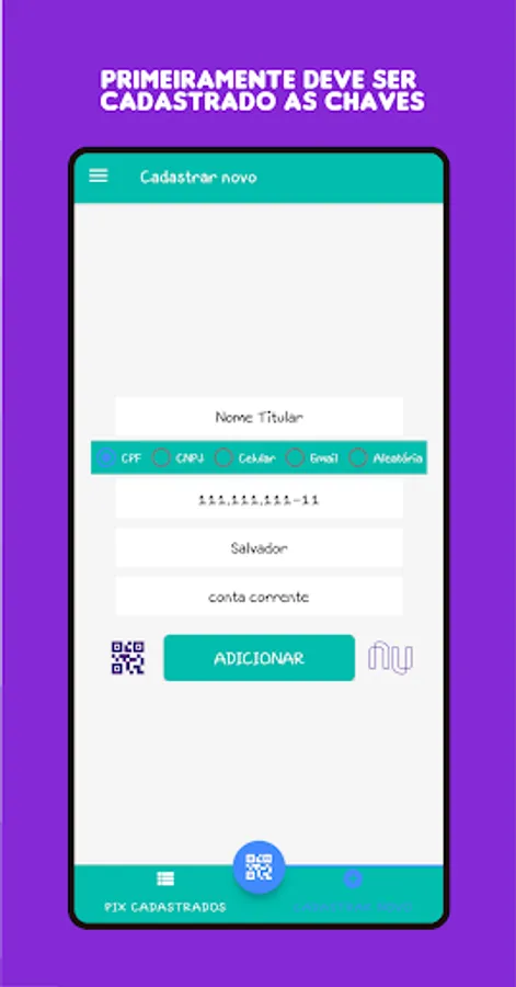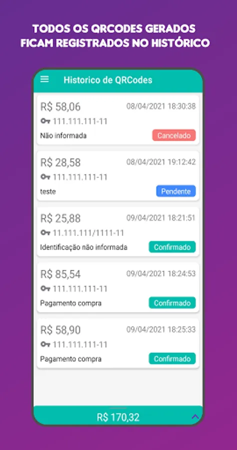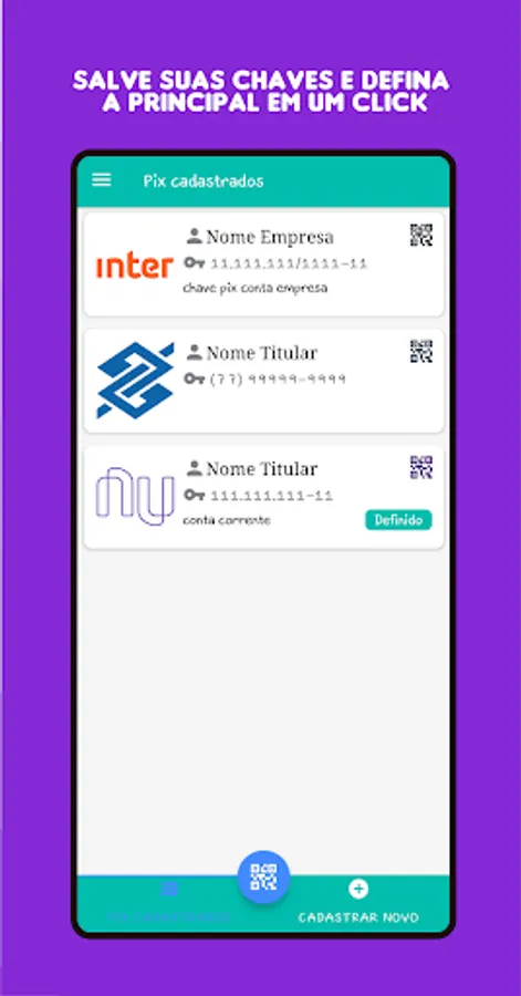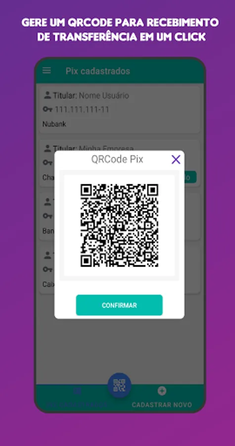 With ePix the user can save all their keys from Pix, the payment system of the Central Bank. After the key is saved, the user can quickly generate a QRCode Pix, already with the value, to receive a payment/transfer from another person.