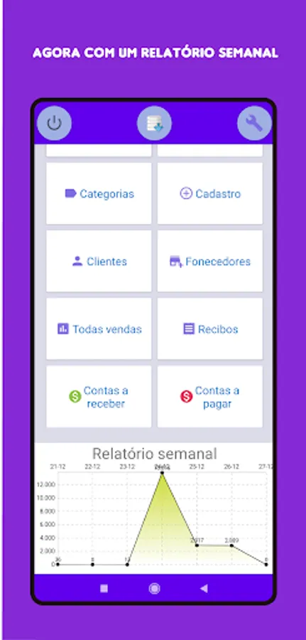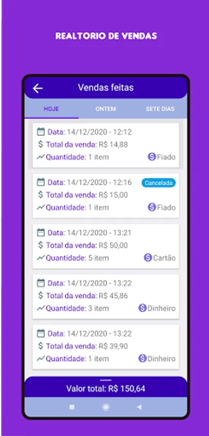 Has sales report by current day, previous day and last seven days, in addition to a personalized period.