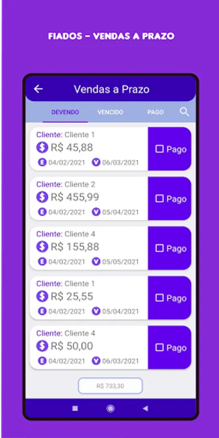 The application has control of sales and product inventory, as well as registration of products, customers, installments (term), product categories and suppliers.