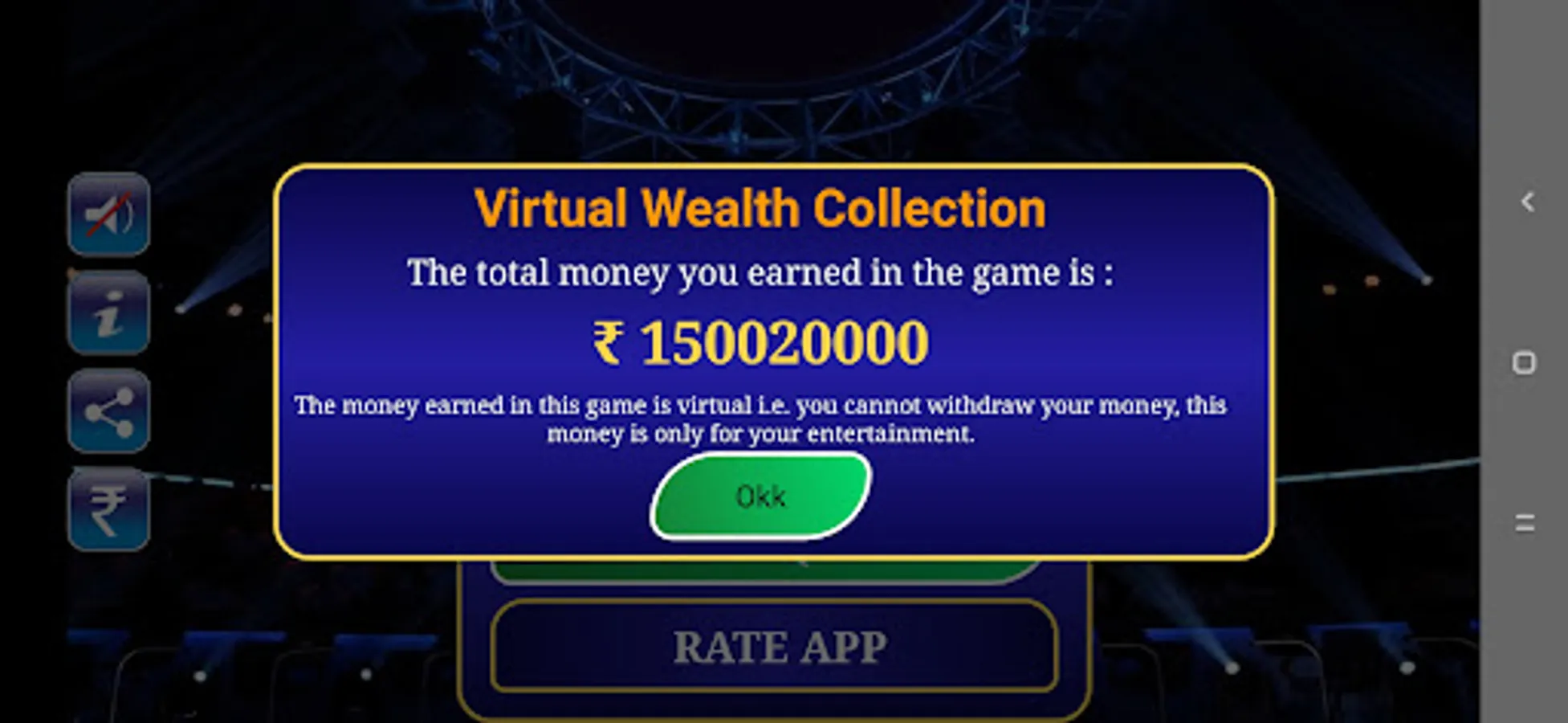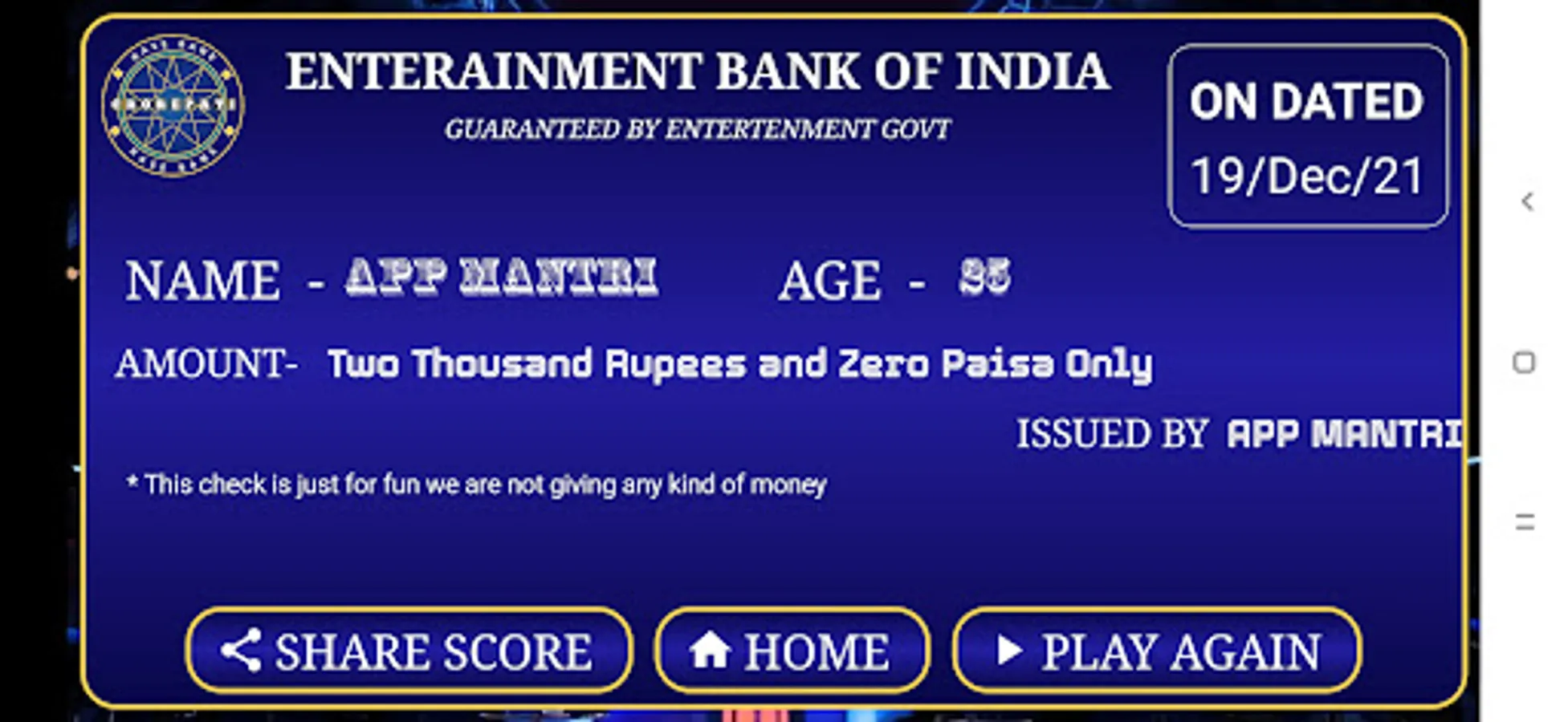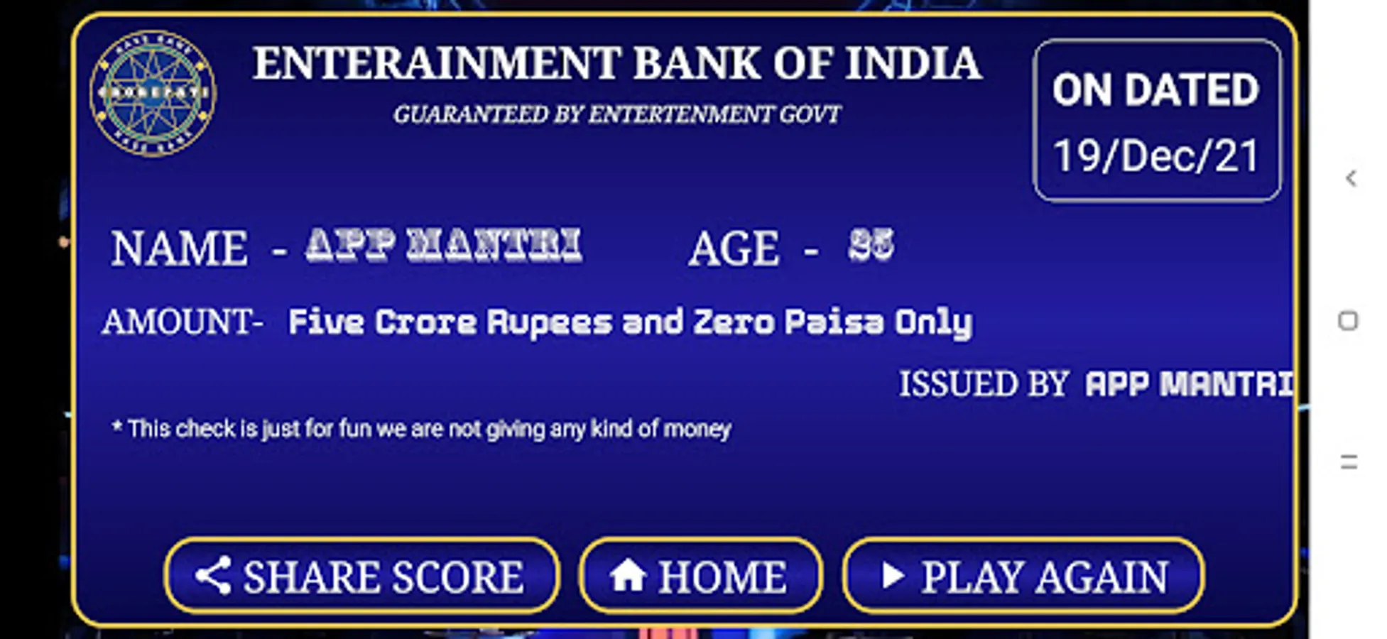 This game does not represent any official tv channel and we do not provide any real cash or cheque through this game. This is a simple Triva category Quiz game only made for purpose of improve general knowledge of our users. Drop us an email(appmantri@gmail.com) if you have any dispute.