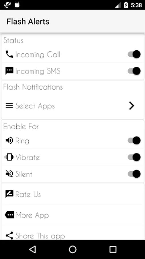 Flash Alerts is a application which will use your camera flash to make light blinking signals while device is ringing or new notification message is received.