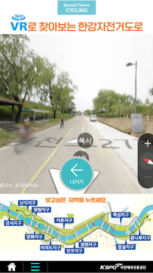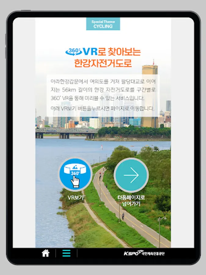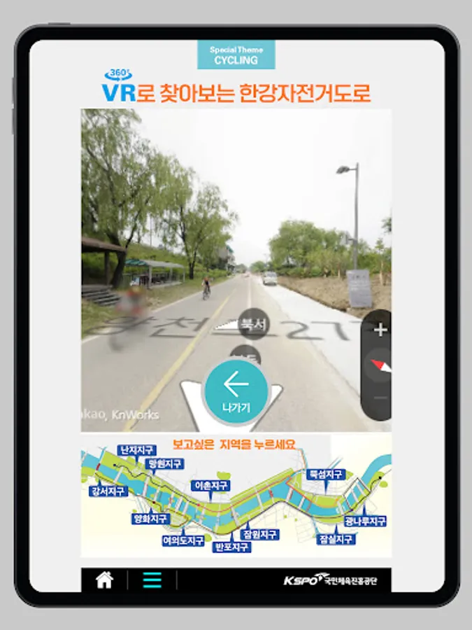 You can check the basic information of the cycle and the information of the Han River bicycle road on mobile in 360-degree VR. Through this app, we will continue to update information to help public health.